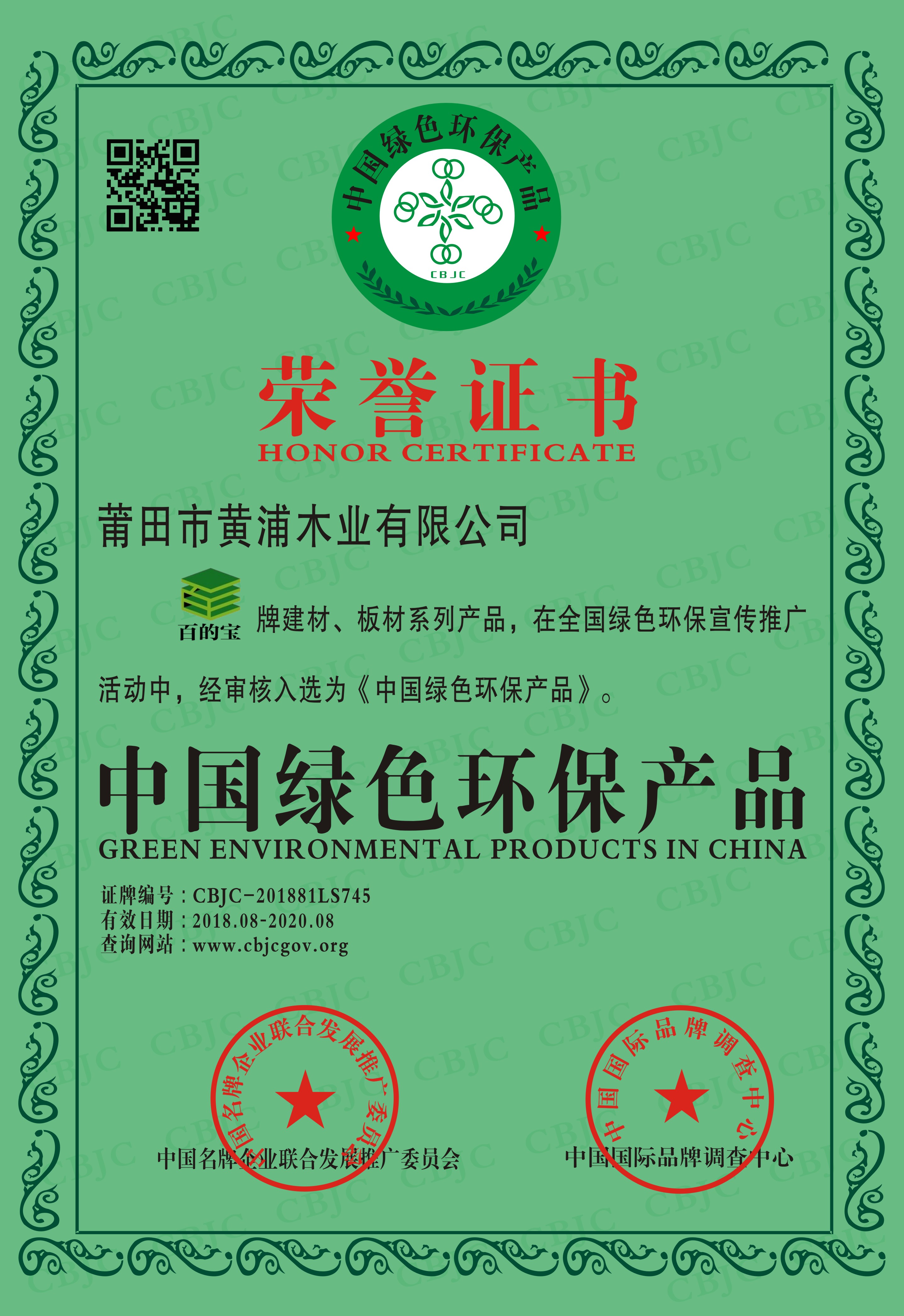 2018年8月“百的寶”牌板材系列產品在全國綠色環保宣傳推廣活動中,被中國名牌企業聯合發展推廣委員會、中國國際品牌調查中心選為 “中國綠色環保產品”!