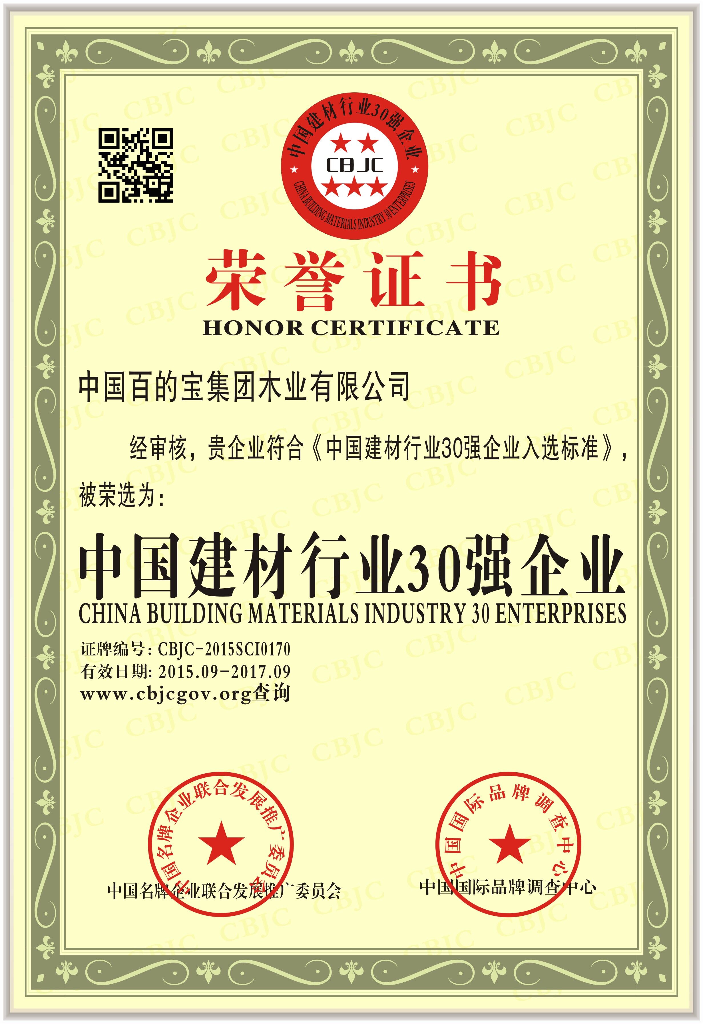 近日,中國百的寶集團木業有限公司經審核,公司符合《中國建材行業30強企業入選標準》,被中國名牌企業聯合發展委員會授予“中國建材行業30強企業”榮譽稱號。