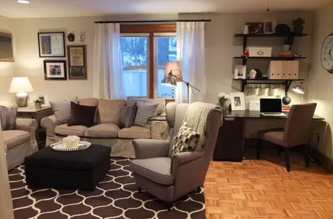 高級玩法,通過不同地板區(qū)分客廳與書房,混搭有風(fēng)險,使用需謹慎。