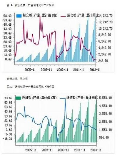 2013年11月,我國人造板產量為2605.8萬立方米,同比增加1.8%;累計產量24349萬立方米,同比增加5.1%;同比增速均在放緩。具體到膠合板,11月份產量為1489.78萬立方米,同比增長5.4%,累計產量14152.3萬立方米,同比增長8%;纖維板方面,11月份產量為600.97萬立方米,同比增長-1.82%,累計產量5358.77萬立方米,同比增長3.12%。產量的下降意味著市場需求的減弱,人造板需求高速增長的時代已經過去。