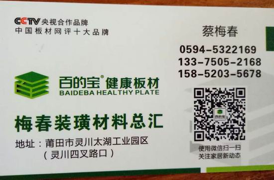 靈川專賣店蔡總表示:“選擇百的寶,看中的是品牌良好的口碑和市場形象。百的寶板材的營銷策略一直都是以人為本,以康為責;為消費者提供健康、安心的高品質家居產品,這一點也是最吸引我的地方。選擇百的寶,加入百的寶也是想要把這樣一個一心為消費者做健康板材的品牌做大做強。”