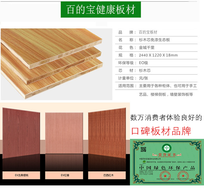 4、百的寶生態板達標E0級標準,環保健康不含有甲醛、甲苯和任何有害物質,其優良的環保性能讓消費者使用起來完全無憂。